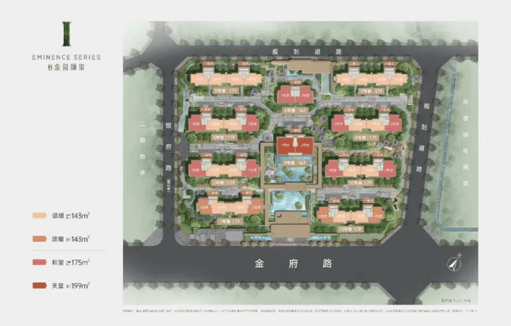 作为约94亩的稀缺大盘,金誉颂玺采用分两期开发策略。一期占地约52亩,容积率约2.5,规划为7-17层的纯洋房与小高层。社区采用南北十字中轴阵列式布局,避免楼栋拥挤与对视,实现超宽楼间距。