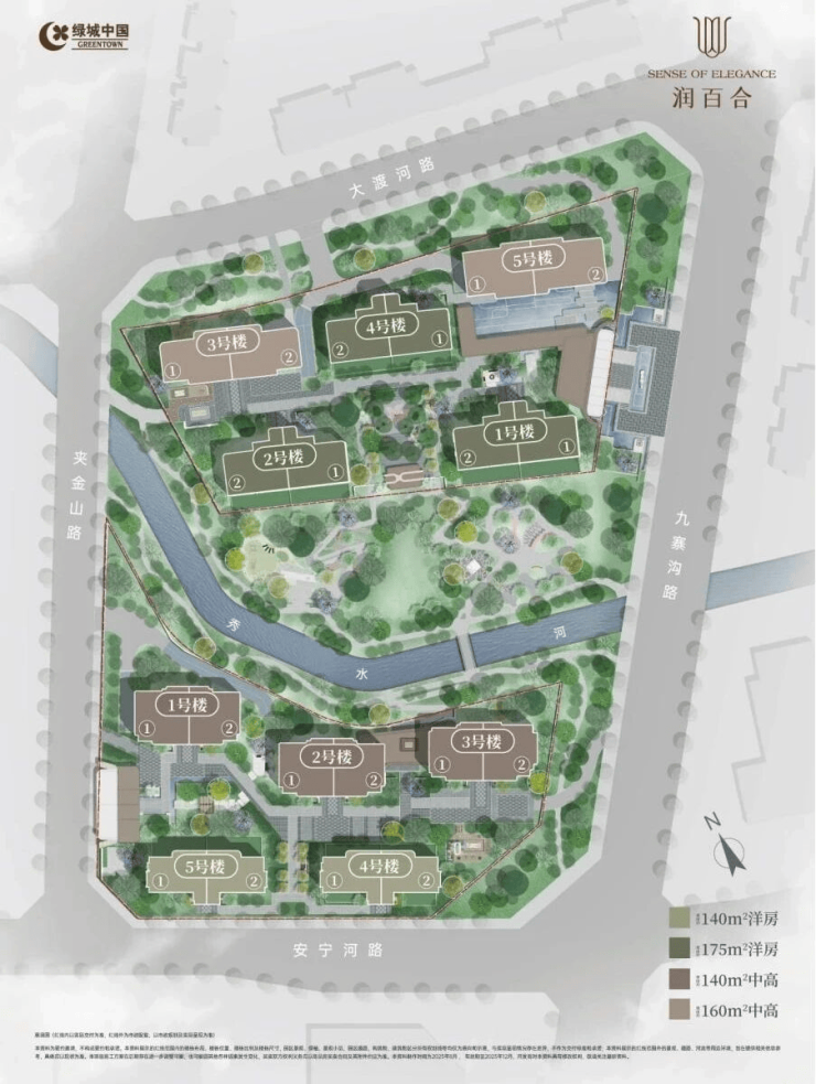 绿城润百合主打洋房140㎡、175㎡与小高层140㎡、160㎡四大全新升级户型。北地块精心布局五栋建筑,其中1、2、4号楼为7层洋房,均配置175㎡四房两厅四卫;3、5号楼为17层小高层,统一采用160㎡四房两厅三卫设计。南地块同样规划五栋建筑,1、2、3号楼为17层小高层,均为140㎡四房两厅三卫;4、5号楼则为7层洋房,同样采用140㎡四房两厅三卫格局。