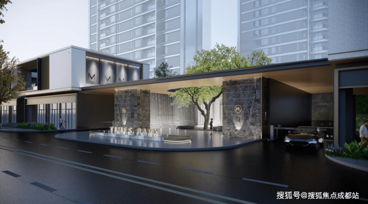 主入口采用门庭与景观一体化设计。超30米阔尺仪门与约5.6米挑高,采用深灰石材墙面与铝板顶饰,彰显尊崇气质;