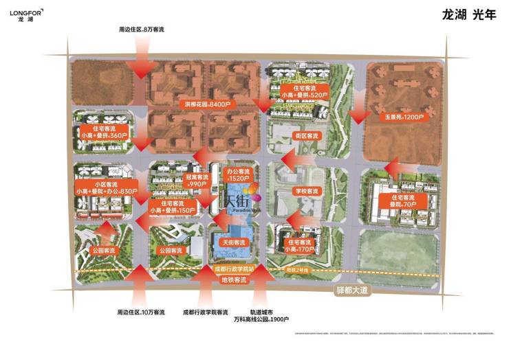 【繁华商业】:以龙湖光年为中心,自持14万方驿都天街,周围绿地468,伊藤洋华堂亚洲旗舰店,华熙528,万科里等商业氛围浓厚。