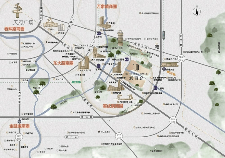 位于项目上游的攀成钢板块,凭借其国际化社区氛围与高端商业配套,已成为成都东二环的城市名片。随着区域土地资源日趋稀缺,积淀已久的地缘改善需求正期待优质产品的入市。绿城润百合以"当代攀成钢定义者"之姿,融入东大街城市更新廊道,不仅填补了板块高端改善住宅的市场空白,更将助推攀成江东岸区域的价值跃升。