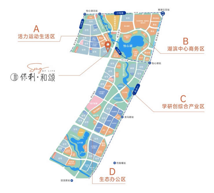 怡心湖作为城南唯一枢纽湖区衔接东南西北各个组团,吸附周边区域,共同形成“大怡心湖板块”