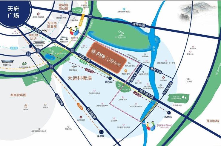 交通十分便捷:4号线地铁终点站-西河地铁站700米,春熙路30分钟到三环6公里,开车8分钟左右;到二环路仅10公里,开车12分钟左右;到市中心春熙路也仅20多公里,开车半个小时内。政府未来交通规划:20/30号线地铁,大运会到东安湖的BRT 快速公交,及成洛大道未来会改造成成洛简快速通道直达天府机场
