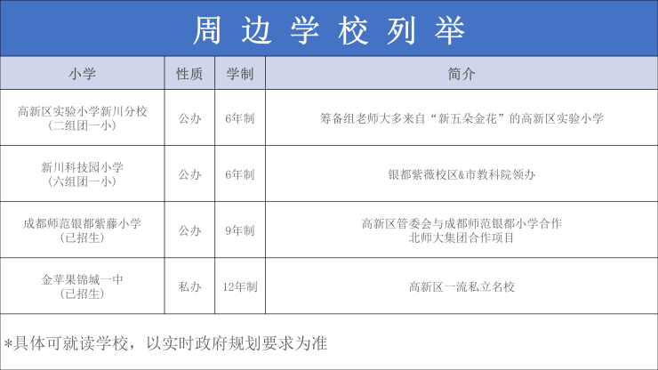 从幼儿园、小学到中学,K12全龄段菁英学校,师资+硬件+生源,家门口的优渥教育体系。幼儿园:高新区新川二幼、三幼、四幼、新川里幼儿园等。小学:银都紫藤小学(南北校区)、新川科技园小学、高新实验小学新川分校等。中学:银都紫藤中学,省教科院附属学校、金苹果锦城一中等。(具体可就读学校,以实时政府规划要求为准)。