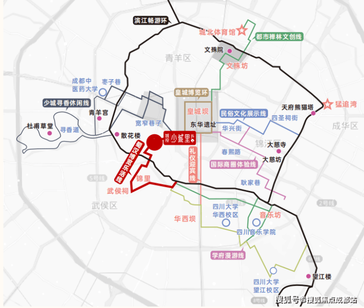 项目位于城市内环青羊区,为“中优”战略重点实施区域,新城、源城双擎发展;板块地处蜀汉博览乐活线及青羊区中优区域规划重要单元,北连皇城坝,祠堂街,南连武侯祠、宽窄巷子等,聚集成都市区优质文游资源,教育资源,未来片区还将构建天府文化公园,打造文博创意集聚区和金融高端商务集聚区。