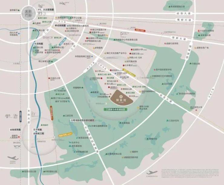 锦宸院所处的驸马板块坐拥得天独厚的地理优势:西接15000亩三圣乡生态绿海,东临3公里绿湾半岛景观带,形成"城市界面+生态资源"双重价值叠加。这种独特的"绿洲半岛"格局,既承接金融城-林家坝城市发展势能,又延续太古里—东大街商圈繁华基因,构筑起主城区稀有的黄金三角地带,为业主提供稀缺的城市生态居住体验。