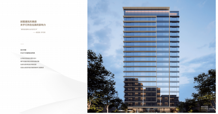 超镜体映景立面,随角度的变换,流映自然四季与超塔的视觉艺术。以欣赏者视角为设计语言,锻造香槟金铝板,镶边轻奢金属线条,米灰色仿石漆、落地窗、大面宽的艺术界面,塑造蓝灰LOW-E幕墙的流线美学,契合高窗墙比,让建筑体本身成为一道风景线。