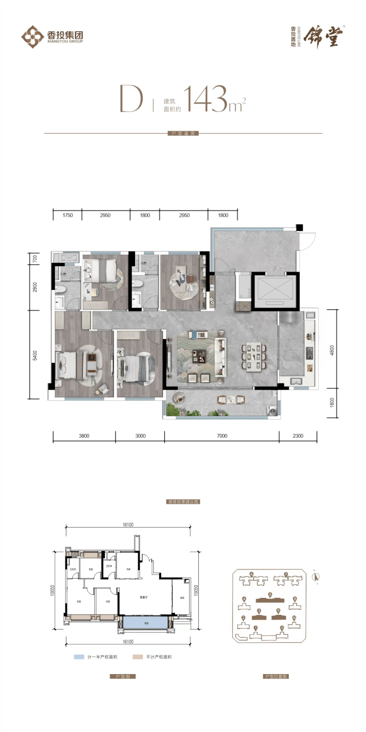 总建筑面积约143㎡,包含四个卧室、两个客厅和双卫生间。
