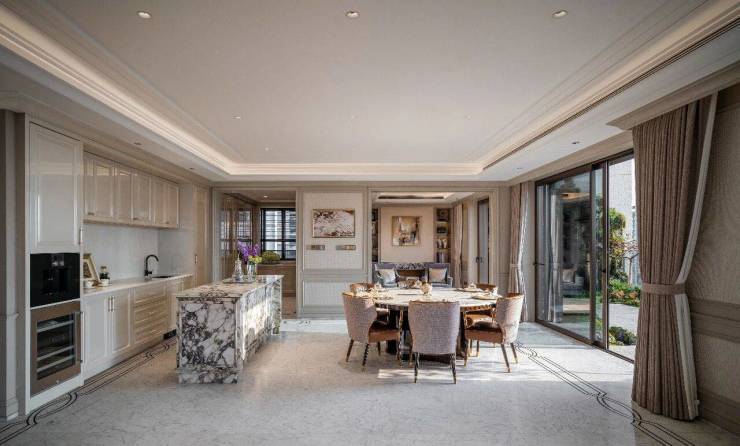 精装户型选用全球奢材,意大利雪花白石材、22mm厚进口橡木原木地板遍布室内;标配大金中央空调、威能地暖、高端新风三大件,厨房搭载嘉格纳全套家电,卫生间采用劳芬、当代等顶级品牌,连龙头都堪称艺术品;全石材地面拼花、全原木饰面,每一处细节都尽显重工重奢质感。