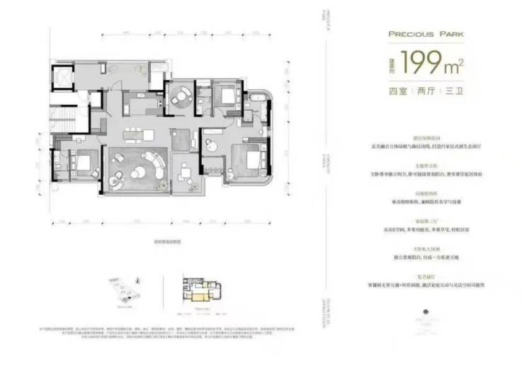 该户型布局巧妙,拥有开阔横厅与独立多功能区。经过精心规划的景观阳台视野极为开阔,整体空间尺度与功能配置完美融合,充分展现现代人居美学理念。 199㎡四室两厅三卫(B户型)