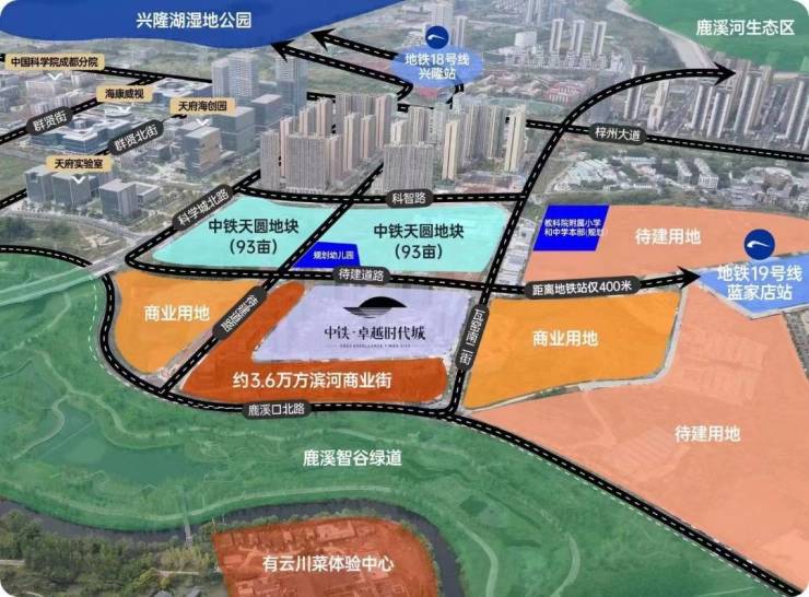 四条地铁1号线、16号线(规划中)、18号线、19号线四地铁交织距离19号线规划站点(蓝家店)站仅约400米,直通天府国际机场