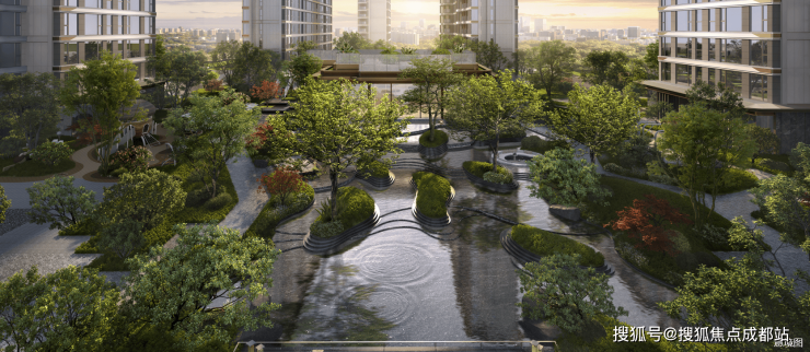 中庭核心景观:保留大面积的中央庭院水景,形成层次丰富的互动空间,将园林景观体验最大化。