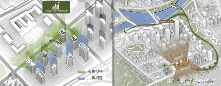 视野的广度,首先由土地的基因决定。金融城三期以金融城东TOD城市地标为核,八个住宅地块呈“向心”式分布,朝向地标的面宽尺度,决定了土地城市视野价值。