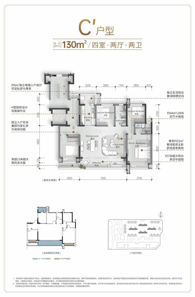 130㎡:双开门独立玄关,全景阳台瞰景