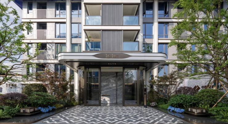 入院美学-深藏宁静与奢华;独立主题单元入户花园,设置双侧叠水溪景归家入户,运用现代科技水刀拼花雕刻古典川蜀纹样,入户门头采用石材和弧形玻璃精致交接,细节上处处体现华曦府对于美学艺术的追求。