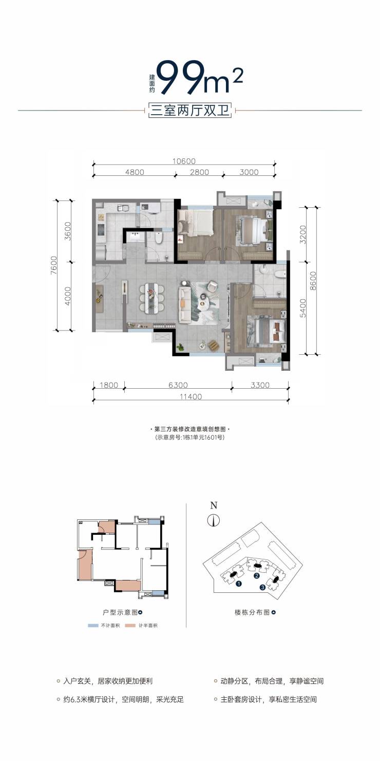 整体规划采用半围合式布局,约5000㎡中庭园林景观,享超大楼间距,互不遮挡