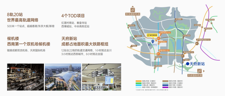 城市候机楼——西南第一个双机场候机楼,每年超2000万人从这里出发。轨道交通——8规20站4TOD,超越香港/东京大板/新宿世界最高轨道网络,实现成都境内外超2000万人口轻松抵达。天府新站——12台22线,实现1小时抵达全川,3小时抵达西部城市,8小时抵达全国