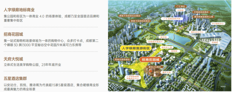 天府新区惟一可形成商圈的板块,集人字绿廊低密情景独栋商业招商花园城购物中心中粮大悦城购物中心及众多五星级酒店集群,形成比肩上海陆家嘴/春熙路商圈的每年超500亿+的城市级商业中心。