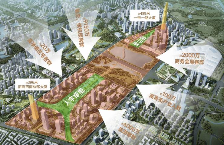 双地标中心——489⽶⼀带⼀路⼤厦396米的招商西南总部大厦,形成西部最高的双城市地标,通过“人字绿廊+望山廊”串联;每年将吸引超千万的国内外旅游度假打卡客群
