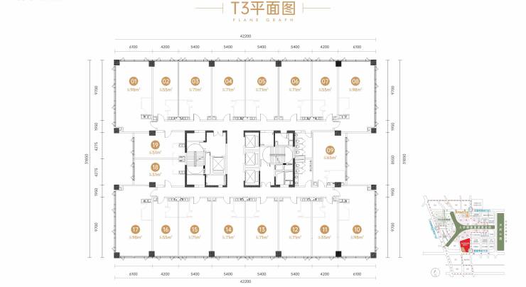 面积区间 :T2 栋 45-92 ㎡(主力 45 ㎡) T3 栋整售 单层面积 T2 栋 1278 ㎡,T3 栋 1352 ㎡