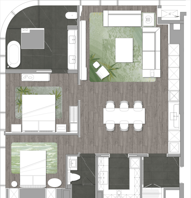B、C户型面积60㎡、69㎡,采用精致当代的设计风格,以“无界”生活为设计主题,构建出一座给未来派 KOL(key of leader)的“定制私寓”空间。客餐厨和玄关一体化的新锐布局;放式厨房搭配功能性吧台,具备社交沙龙属性的同时又赋予家的舒适;超大尺度的落地窗景灵动套卧设计,设置豪华卫浴四件套与独立衣帽间结合;衣帽间合理的分区,大容量的收纳,质感体验与私密性交融于此。