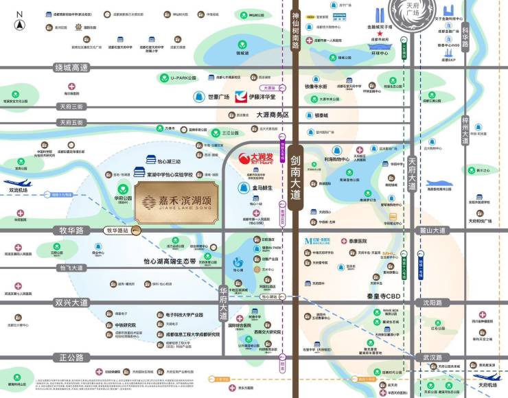 交通:3地铁环绕:22号线(规划中)、5号线(已经通车)、19号线(已经通车距离100米),4纵(天府大道、剑南大道、华府大道、成雅高速)4横(三环路、绕城高速、武汉路、牧华路);