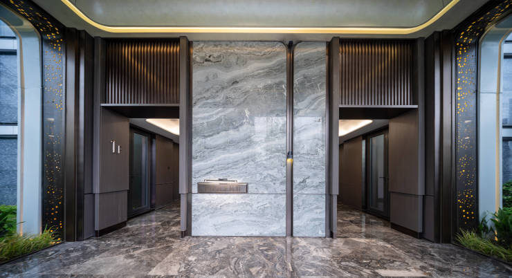 约5.4米层高酒店式归家大堂,全透明玻璃入户,内透出建筑外观高山流水元素的天然石材背景墙,地面通铺全系土耳其进口天然石材,打造精奢质感归家礼遇。