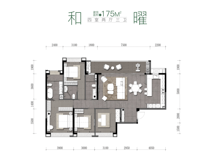 采用南向四开间布局,户型方正通透。四室两厅设计实现动静分区,功能完善。餐客厅一体化连接9.5米观景阳台,拓展生活空间尺度,提升居住舒适度。