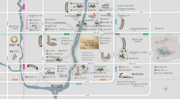成都二环是主城千年文脉汇聚之地;城市发展的肇始之境;焕新升级的核心片区;高端人居的璀璨聚集地。聚集了万象城/东郊记忆/339/太古里/IFS/九眼桥等地标,托举二环板块价值高度。