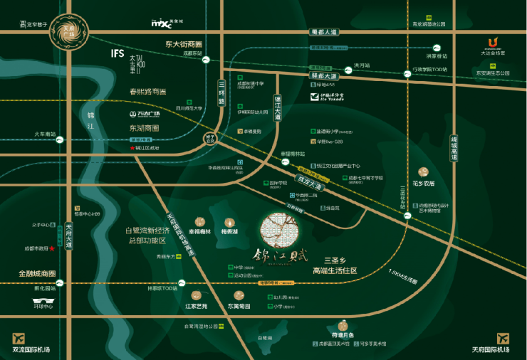 作为成都锦江区三圣乡板块的标杆之作,锦江赋承袭千年商埠文脉,坐拥城市核心资源。项目雄踞锦江大道与成龙大道黄金交汇点,毗邻华西第二医院锦江院区,立体交通网络覆盖:双地铁(13号线、2号线)环绕,南三环、成龙大道等城市动脉纵横交错,构建15分钟都市生活圈。