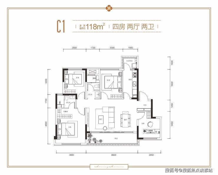 C1户型 约118㎡ 四室两厅双卫双阳台