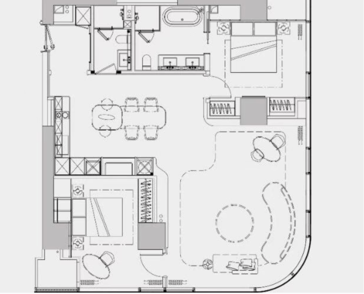 东南端户的主卧套房将时光流转具象化:破晓时分,东向窗棂迎入晨曦微光,开启每日的日出收藏仪式;日正当空,南向落地窗将锦江碧波尽收眼底,游船划过水面漾起的涟漪与玻璃光影交相辉映;暮色渐沉,望江公园的竹影摇曳与四川大学的红墙黛瓦相继入画,成就自然与人文的视觉交响。
