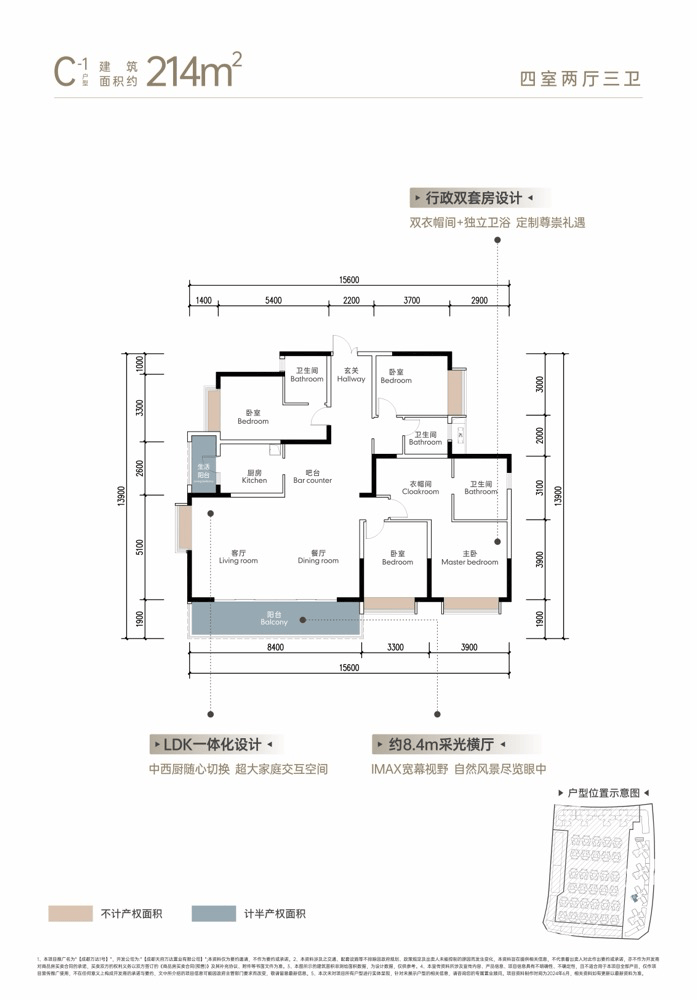 约214㎡奢居四房:约8.4m横厅,270°采光,双套房设计