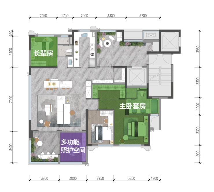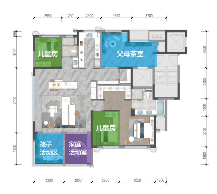 约7米横厅配合双阳台设计与四房配置,在有限面积内实现功能最大化,精准满足青年家庭与小型三代户的核心需求。