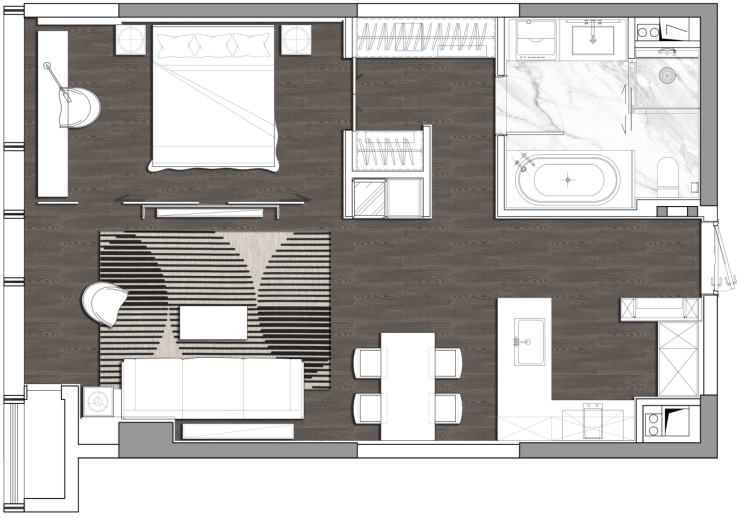 B、C户型面积60㎡、69㎡,采用精致当代的设计风格,以“无界”生活为设计主题,构建出一座给未来派 KOL(key of leader)的“定制私寓”空间。客餐厨和玄关一体化的新锐布局;放式厨房搭配功能性吧台,具备社交沙龙属性的同时又赋予家的舒适;超大尺度的落地窗景灵动套卧设计,设置豪华卫浴四件套与独立衣帽间结合;衣帽间合理的分区,大容量的收纳,质感体验与私密性交融于此。