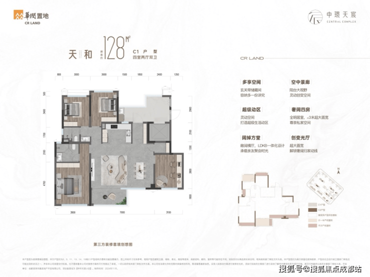 在售产品:建面约110㎡全景舱三房/123-128㎡阔尺四房