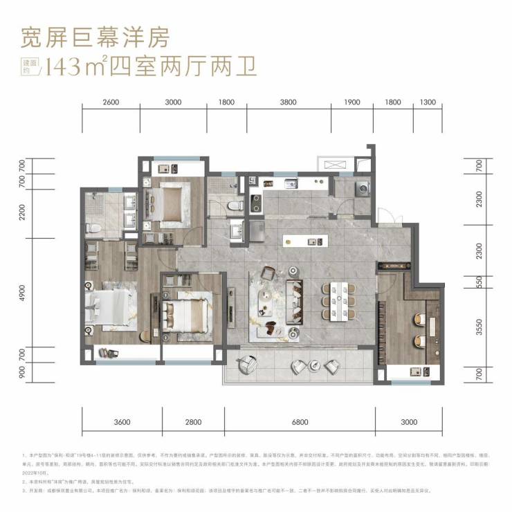约13.7米南向采光面,35㎡餐客横厅;四室全明格局,双套房设计;独立家政间,约6.2米景观阳台。