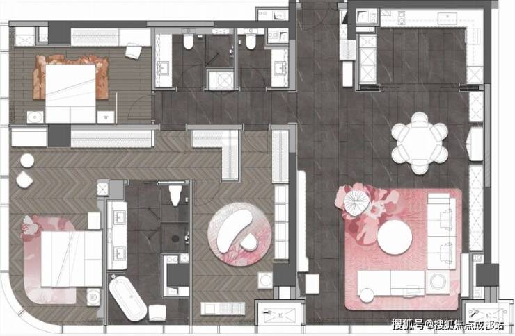 以“云中生活”为主题,因早期规划优势获得大面积赠送,实得面积超300㎡。270°转角窗设计带来全景视野,功能区划分明晰。主卫选用白瓷墙面与绿野仙踪石材,通过色彩碰撞提升空间质感。