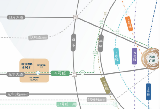 三横一环:日月大道、光华大道、光华8线(建设中)与四环横纵交汇,快速通达全城。