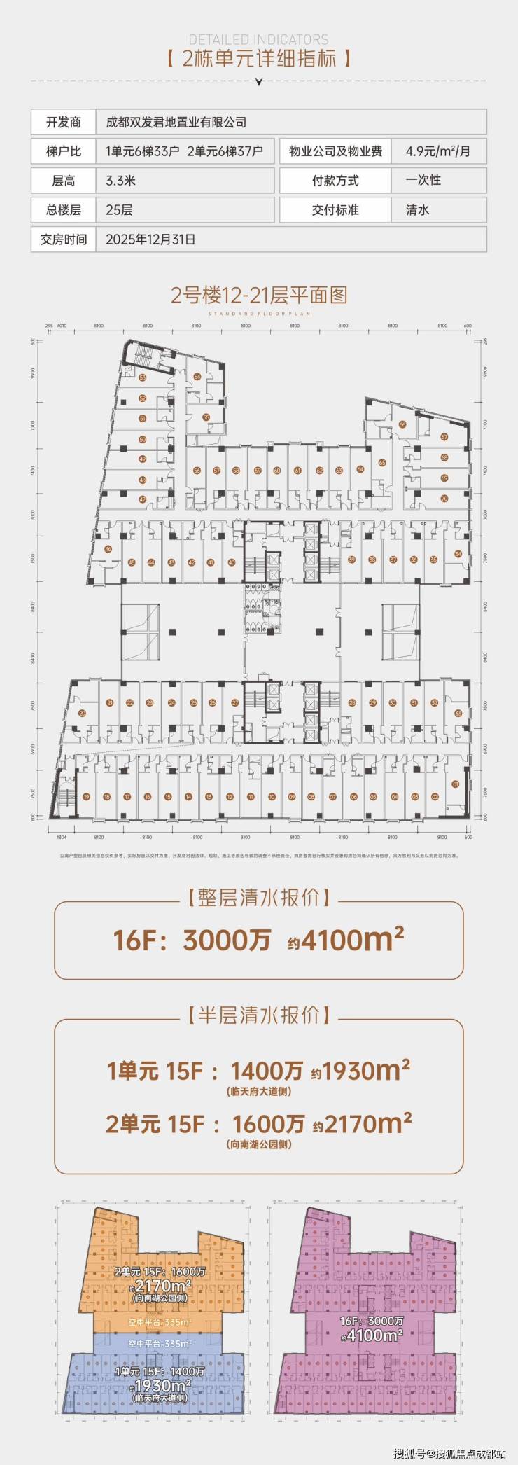 整层配置:15层半层1400-1600万/1930-2170㎡;16层整层3000万/4100㎡