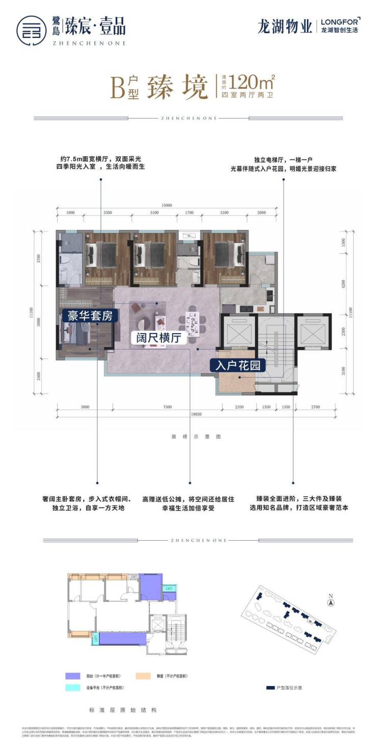 纯粹洋房——14-17层1T1纯板式;私梯入户——户户独享电梯私厅;顶尖户型——120%超高得房率;无忧精装——一键改造 拎包入住;高奢会所——唯一下沉会所