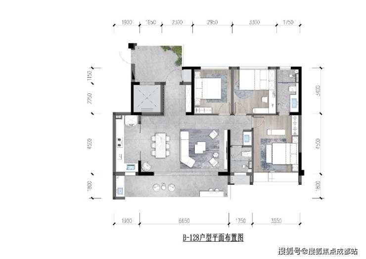 户型方正,空间布局合理,动静分区明确。客厅与餐厅相连,形成宽敞的活动空间,外接观景阳台,可欣赏到公园或小区内部景观。三间卧室分布合理,保证了家庭成员的私密性,主卧带有独立卫生间,方便使用。