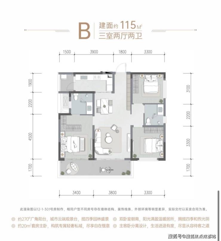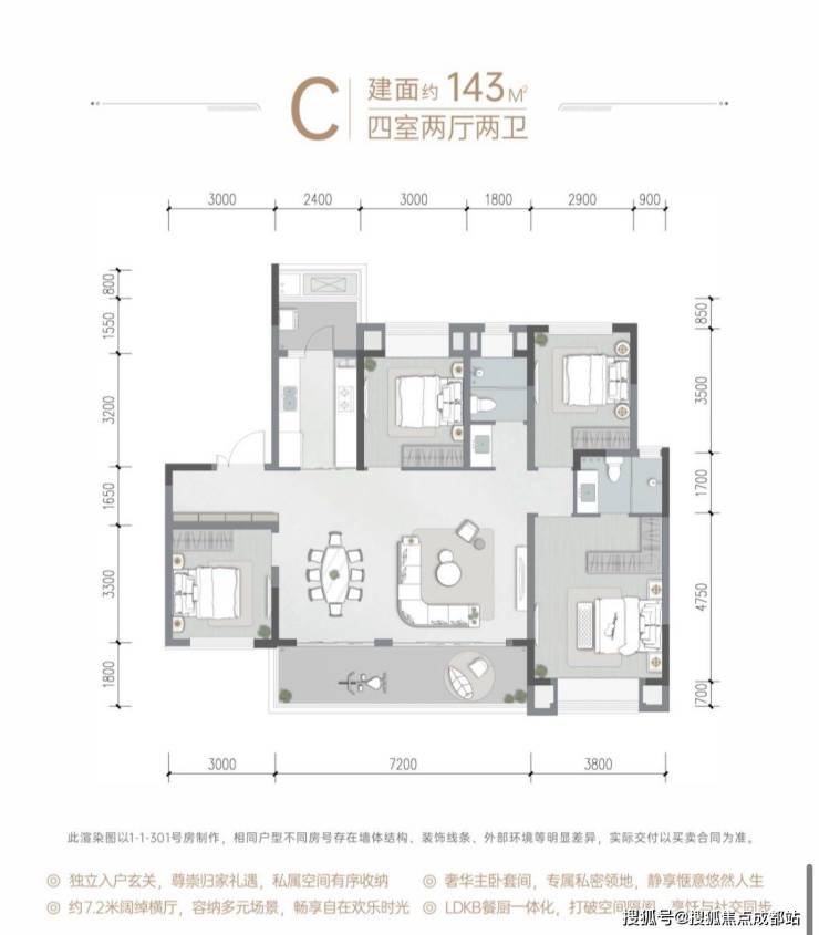 布局亮点:7.2米全景阳台,端厅设计,270°观景采光面,豪华主卧套房。占据社区中央景观位,配独立电梯入户。