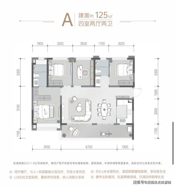 布局亮点:LDK一体化横厅,约8.6米全景阳台,社交型开放式厨房。主卧奢阔开间套房,配步入式衣帽间,空间利用率高。