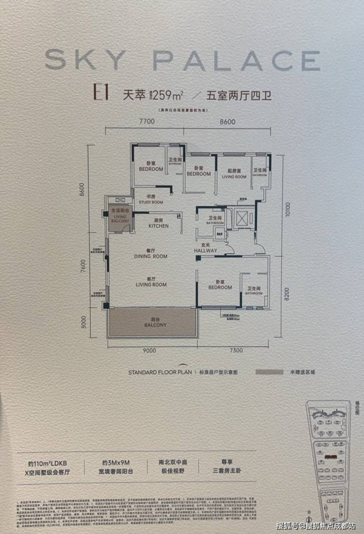 约9.7M超奢阳台,极致观景视野;LDKB一体化会客厅,社交、聚会生活场;墅级双主卧套房,尽显主人生活品位;独立灵动书房空间,栖息身心的理想国