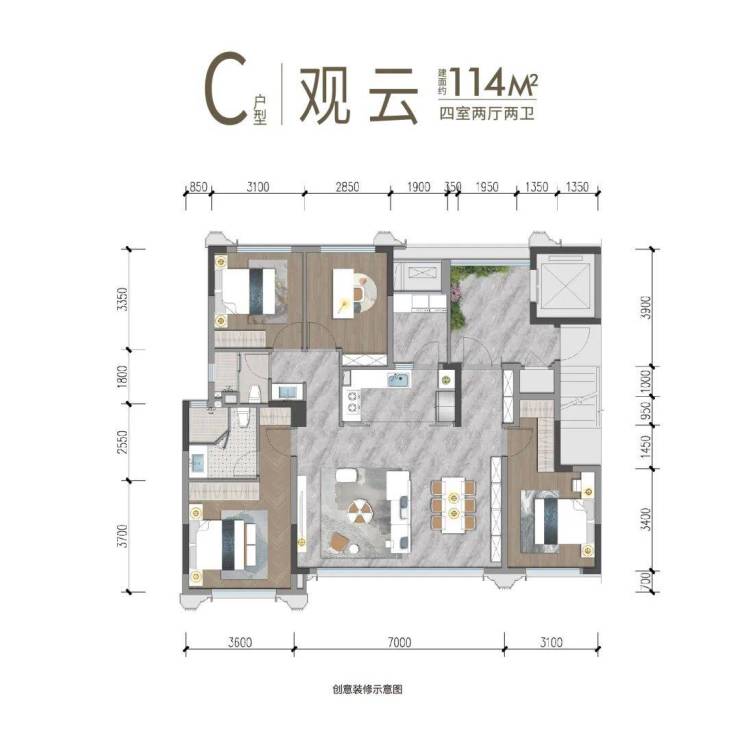 约7米横厅配合双阳台设计与四房配置,在有限面积内实现功能最大化,精准满足青年家庭与小型三代户的核心需求。