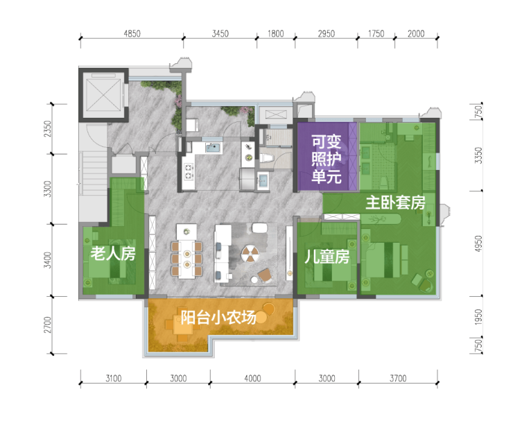 云溪院在140㎡以内的空间里,创造性植入"可生长的第五空间"。这个灵活多变的家庭缓冲区,能根据不同的生活阶段自由切换功能定位,实现空间价值的最大化利用。