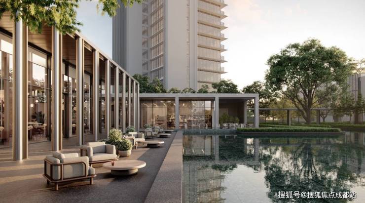 曾仕乾擅长运用现代风格来诠释东方美学。他通过解构古典东方美学中的元素,再以现代手法呈现出静谧与序列感,最终与超级豪宅的气度相匹配,使其成为传世之作。这位擅用现代手法演绎东方美学的大师,以简洁、流畅的线条勾勒出建筑的现代美学。三栋住宅塔楼拔地而起,宛如城市天际线上的精美艺术品。其设计融入了宋代飞檐灵感,采用横向线条美学,横向挑檐的设计元素源自宋代皇家建筑飞檐,犹如流动的丝带,又仿佛是绵延山脉肌理的当代转译。建筑采用全公建化立面,运用玻璃、铝板与石材、陶板的全幕墙体系,并结合视觉黄金比例设计,打造出高端公建化的立面效果,与周边489米超塔地标及天府公园形成完美的视觉呼应。在建筑景观一体化设计方面,曾仕乾将奢华度假酒店的宁静奢华与成都悠闲的生活气质完美融合,让都市度假生活更显静谧有力、低调优雅。「天览」的景观灵感源自东方“庭院”中那份静谧的留白,通过立体化空间构建出仪式感与度假感兼具的现代庭院景观。业主每一次归家,都能感受到尊崇的归家仪式感,仿佛开启一场美好的旅程。25000平的现代庭院景观打造出都市中的绿洲;12000平的中庭如翡翠般镶嵌其中;1500平的中心水景则是这场仪式的灵魂舞台,绿奢石铺就的池底将天光云影凝成一幅水墨画卷。超级豪宅生活美学:三重奢华配套、“1 + 1”服务体系。超级配套:三重奢华配套顶级配套是超级豪宅的核心所在。在「LACADIERE天览」,业主能够奢享约7000㎡的三重配套设施,包括水岸会所群落、专属楼栋泛会所、儿童俱乐部,涵盖21个主题空间,真正展现出顶级生活美学的模样。水岸会所群落——以水为魂,营造灵动空间