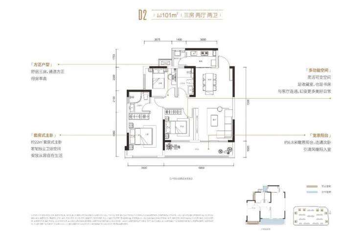 该户型最大亮点在于创新设计双阳台系统,6.8米×1.6米阔景阳台与次卧直接连通。主卧套房面积约22㎡,空间布局科学,无浪费面积。