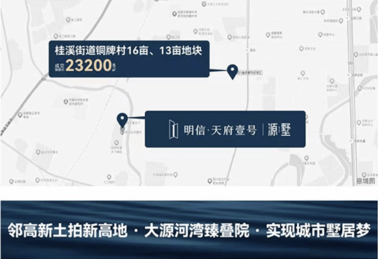 买房就是买地段,核心区的房子始终更珍贵!明信·天府壹号,墅居城南核心区、天府五街旁,怡心湖、双流老城等上游板块,直线距离成交楼面价高达23200元/m的“高新土拍新高”仅约2.5KM。大源罕有在售叠墅产品,享城南核心生活圈,邻民乐TOD、骑龙创新产业园,占据江安河一线河湾,价值优势明显!